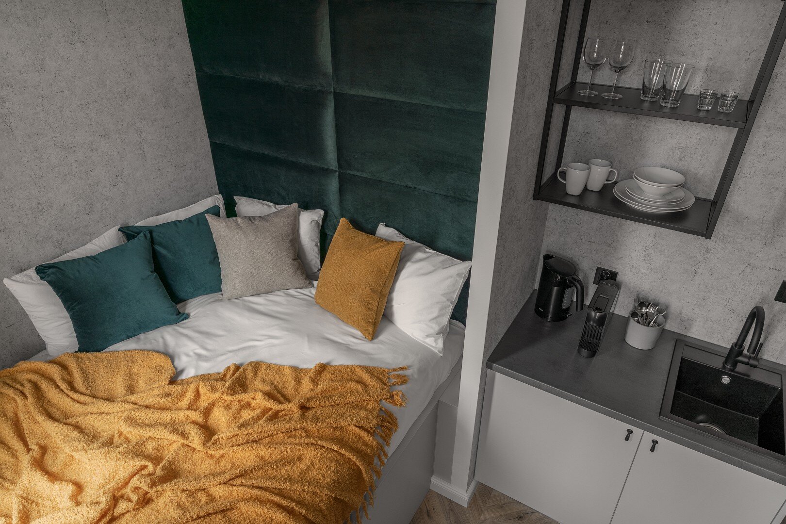 We wnętrzu pokoju czeka na Ciebie wysoka zabudowa łóżka z wygodnym materacem i tapicerowanym zagłówkiem. Naprzeciwko znajduje się Smart TV, który umili niejeden wieczór, a w dalszej części czeka niewielki aneks kuchenny z ekspresem do kawy Nespresso oraz podstawowymi przyborami kuchennymi.