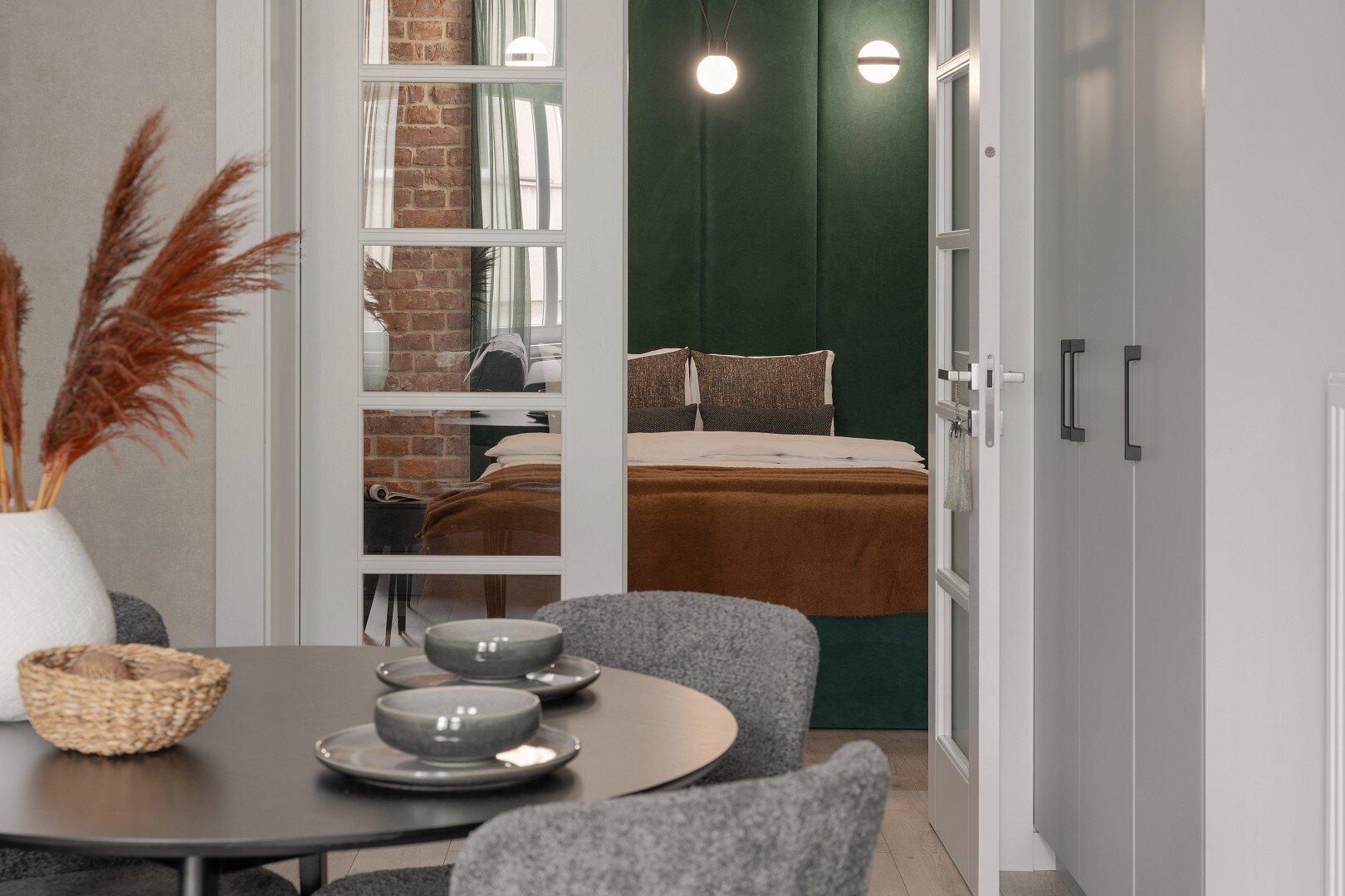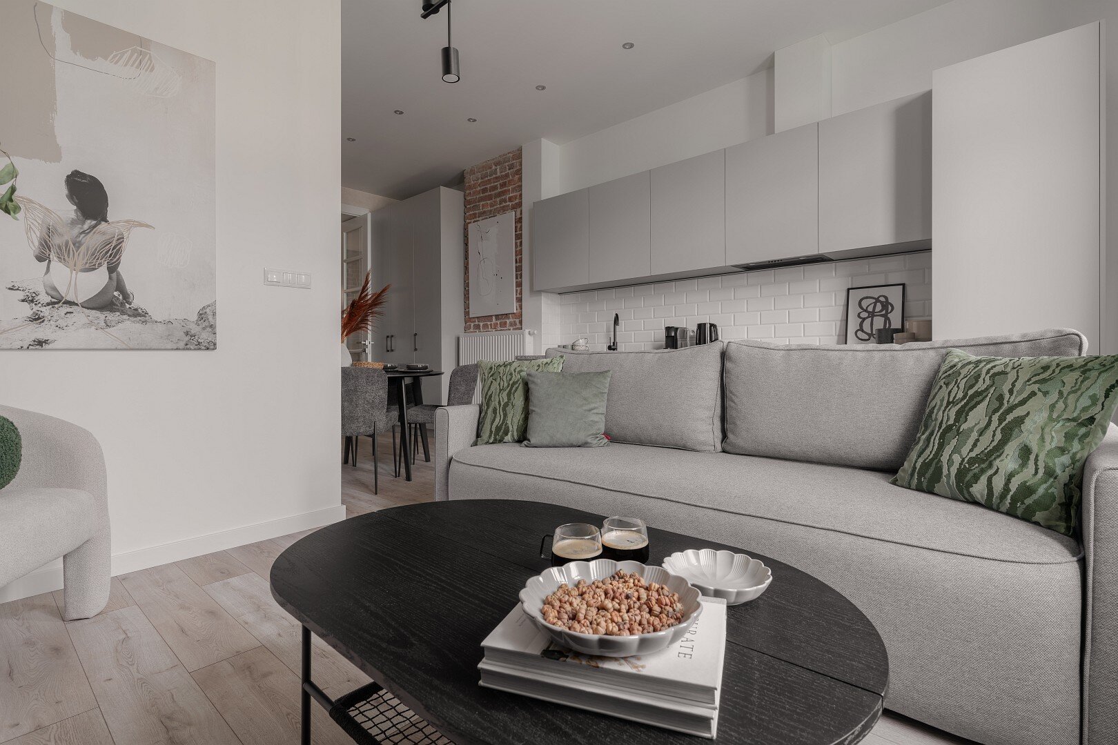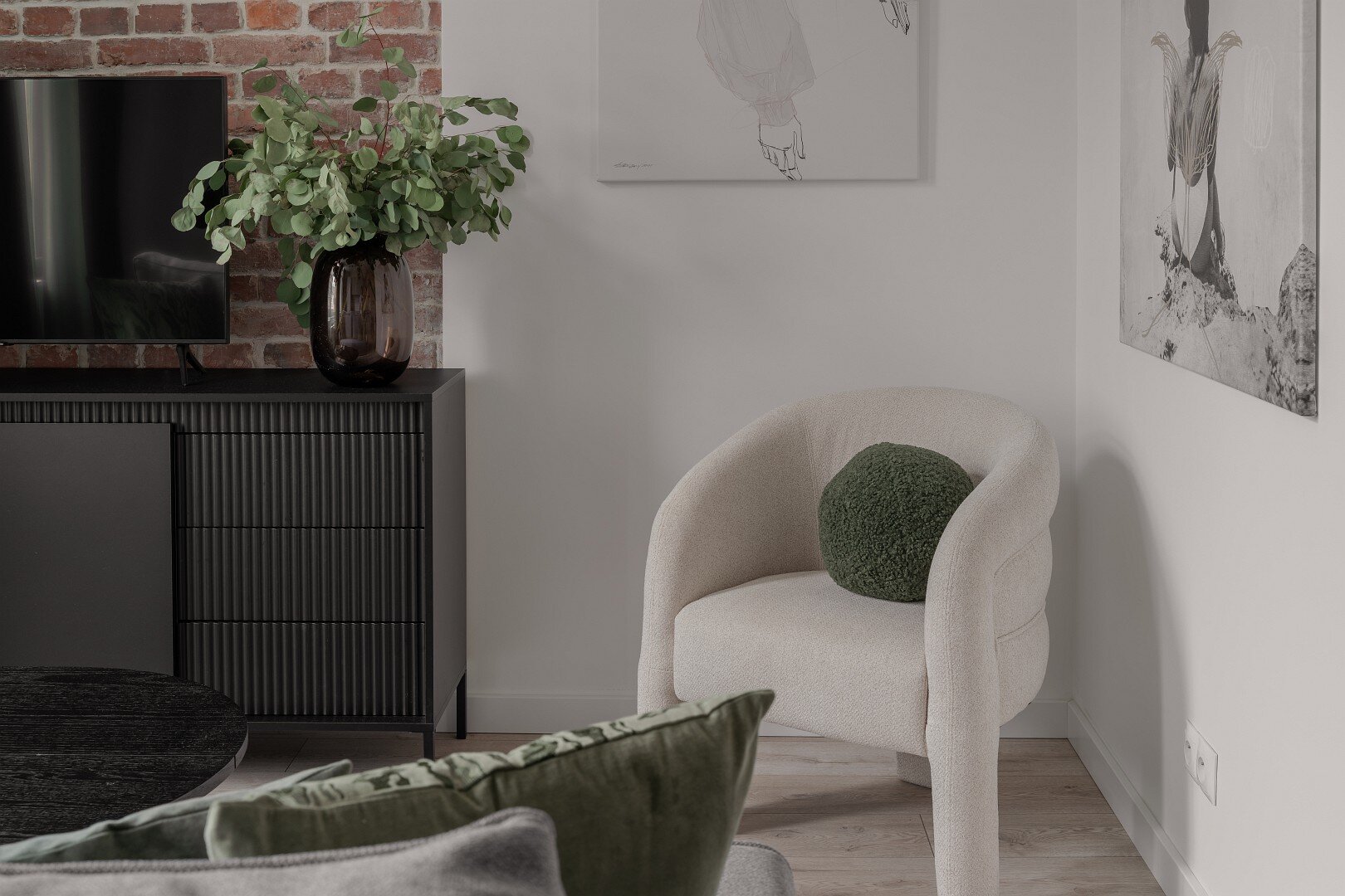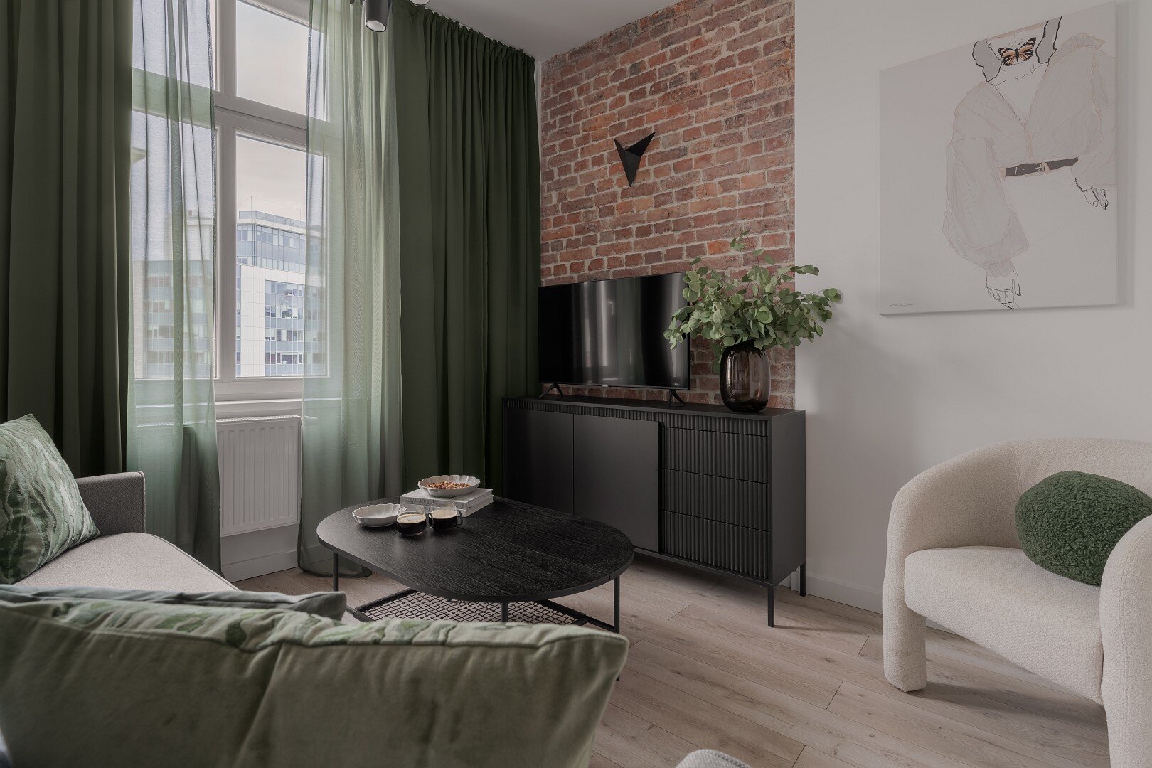 Jasne wnętrze z akcentami w odcieniach beżu i zieleni wprowadza spokój i harmonię, a ściana z naturalnej cegły dodaje mu charakteru i niepowtarzalnego klimatu W przestronnej części dziennej znajdziesz rozkładaną kanapę  oraz jadalnię z okrągłym stołem – idealna na poranną kawę lub romantyczną kolację we dwoje. Nowoczesny aneks kuchenny został w pełni wyposażony, aby można było poczuć się tutaj jak w domu – jest tu ekspres do kawy Nespresso, czajnik, płyta grzewcza i niezbędne naczynia. W osobnej sypialni czeka na Ciebie wygodne łóżko z miękkim zagłówkiem, idealne na relaks po dniu pełnym wrażeń.