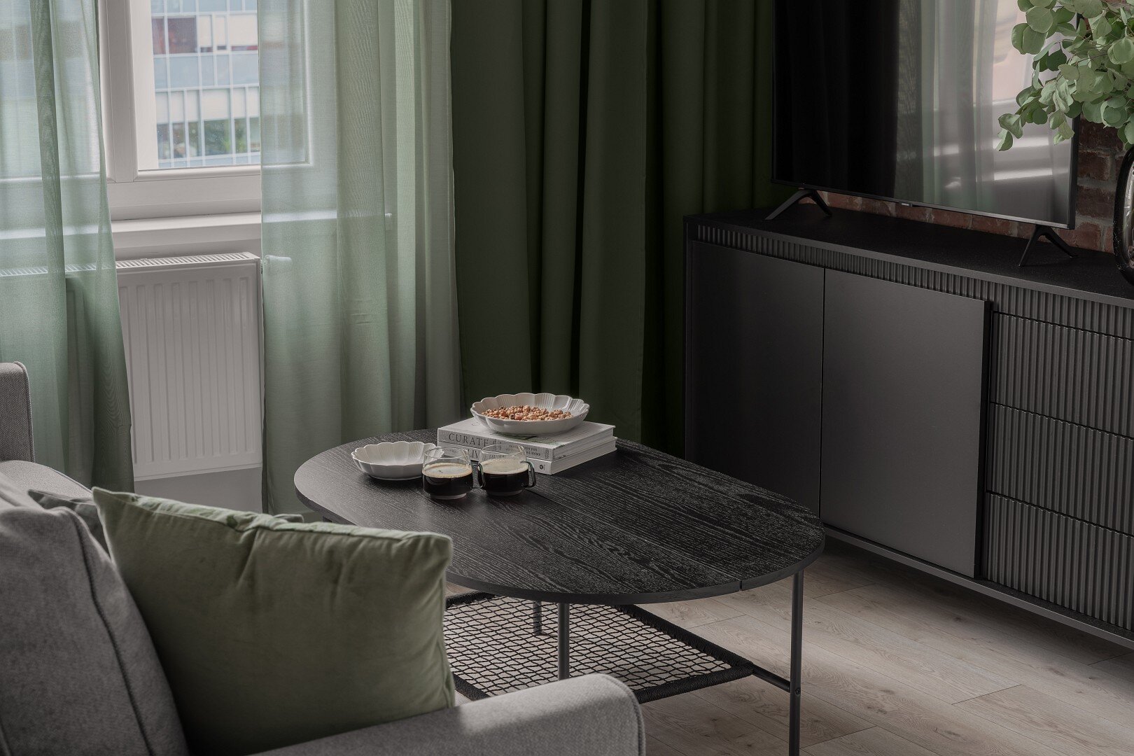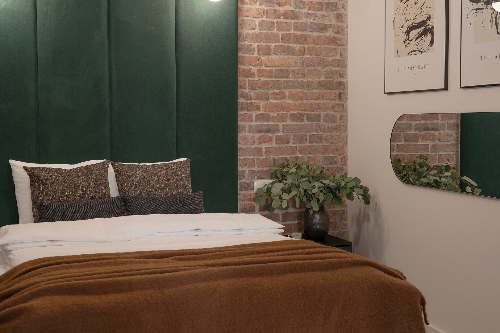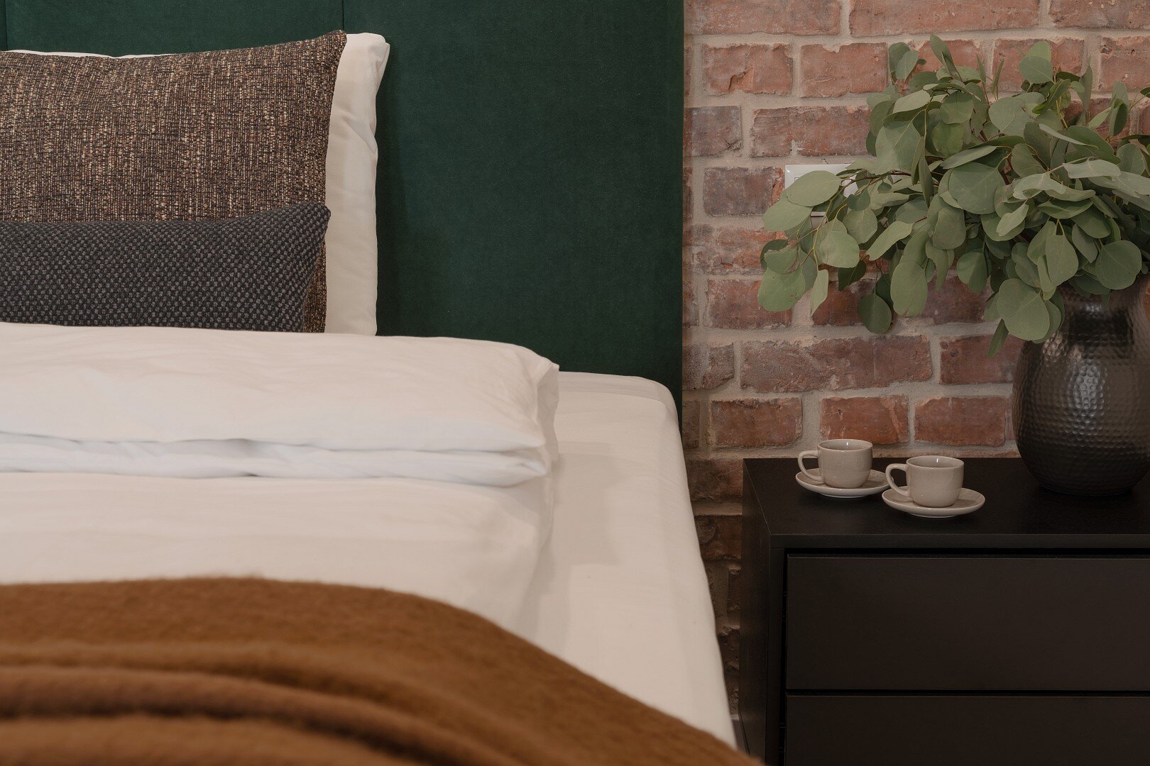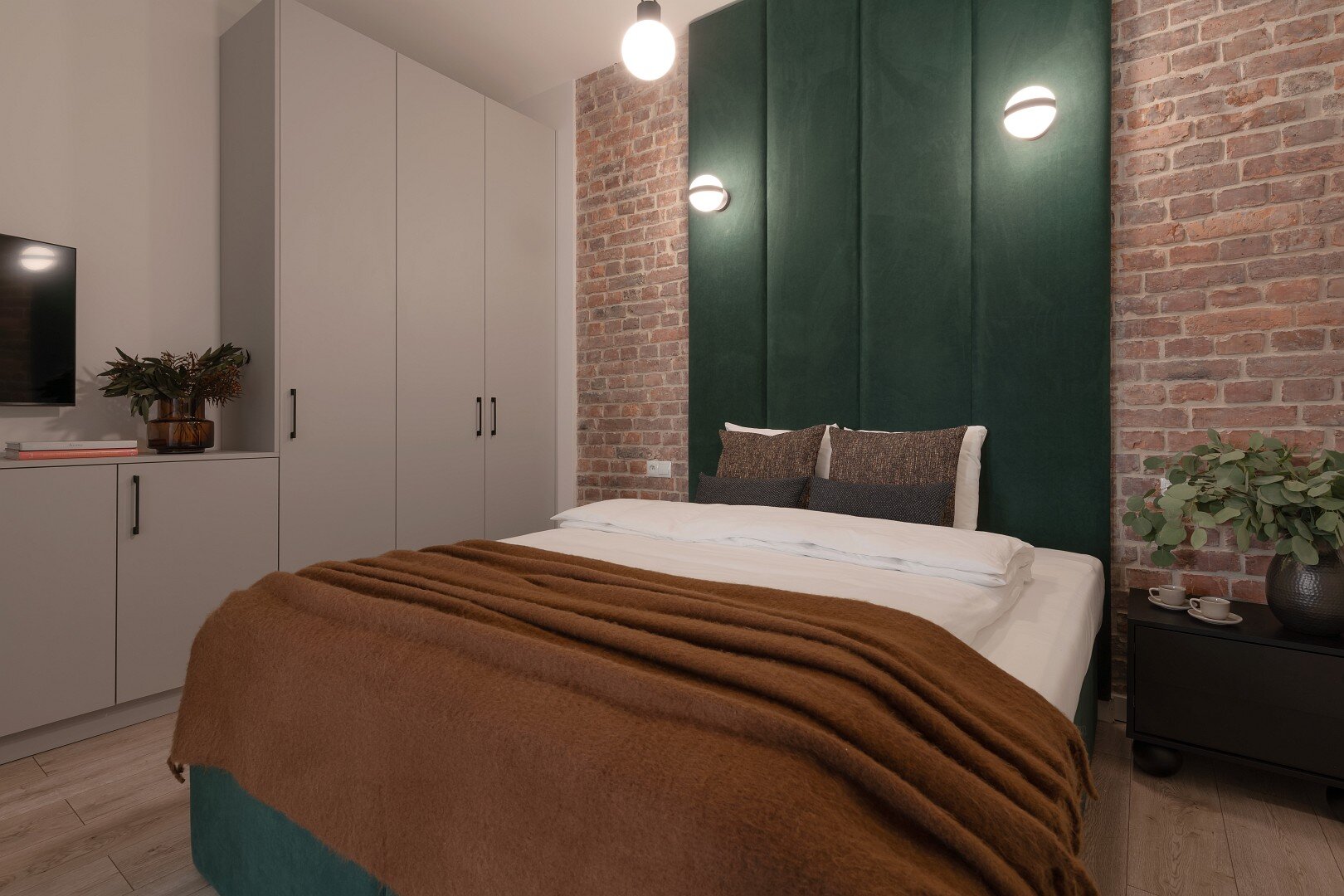Jasne wnętrze z akcentami w odcieniach beżu i zieleni wprowadza spokój i harmonię, a ściana z naturalnej cegły dodaje mu charakteru i niepowtarzalnego klimatu W przestronnej części dziennej znajdziesz rozkładaną kanapę  oraz jadalnię z okrągłym stołem – idealna na poranną kawę lub romantyczną kolację we dwoje. Nowoczesny aneks kuchenny został w pełni wyposażony, aby można było poczuć się tutaj jak w domu – jest tu ekspres do kawy Nespresso, czajnik, płyta grzewcza i niezbędne naczynia. W osobnej sypialni czeka na Ciebie wygodne łóżko z miękkim zagłówkiem, idealne na relaks po dniu pełnym wrażeń.