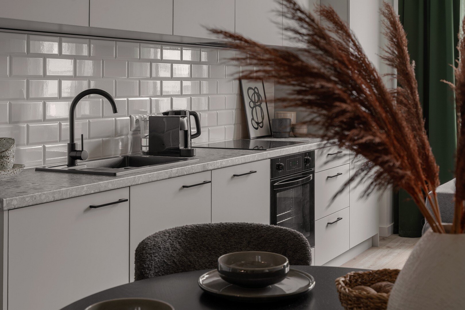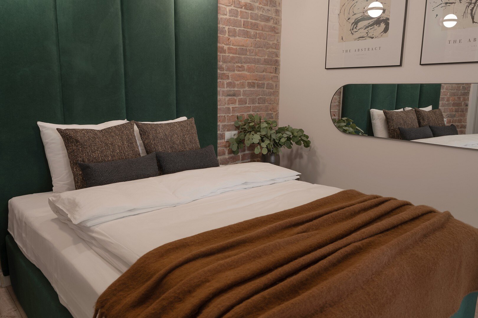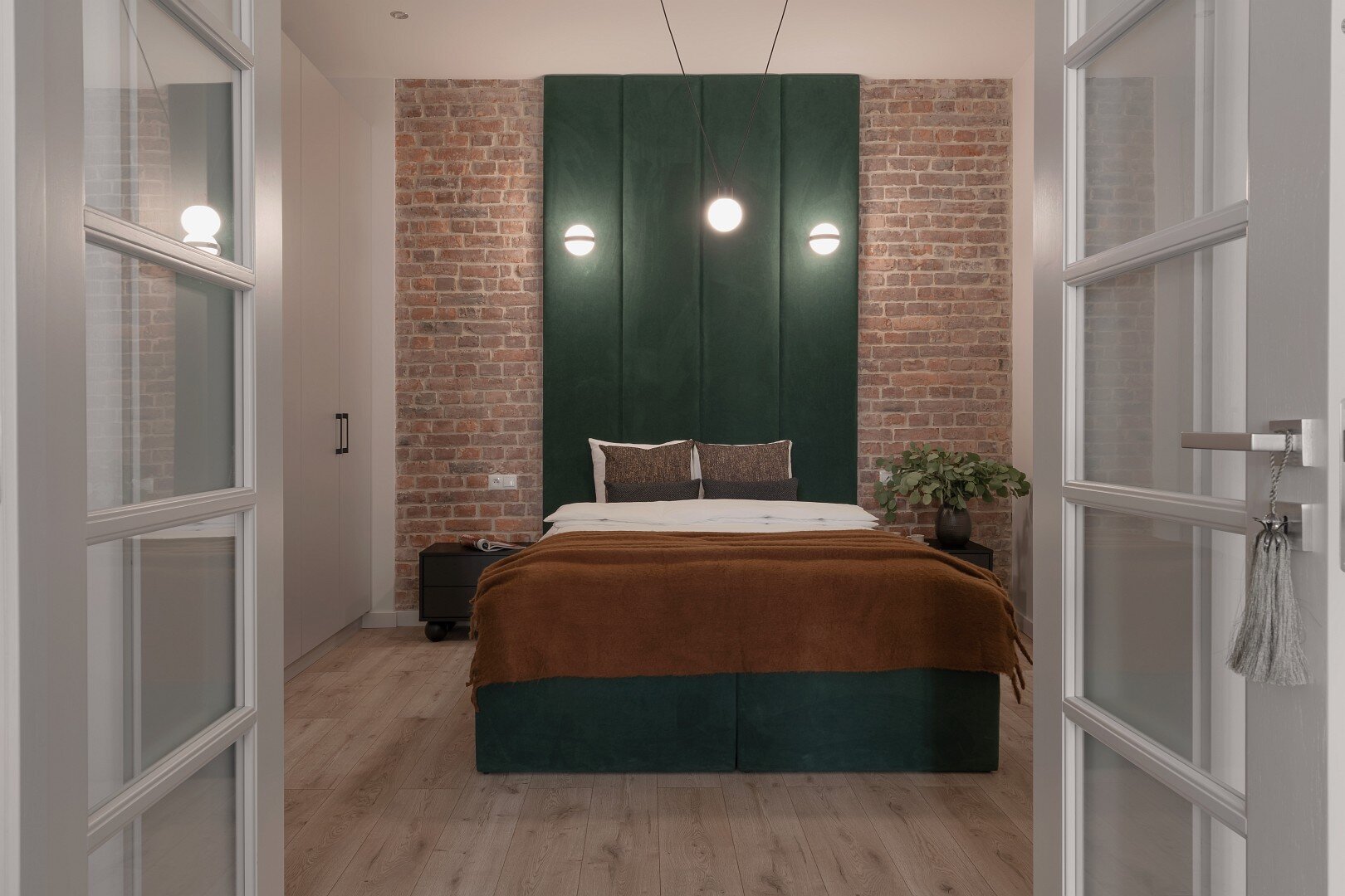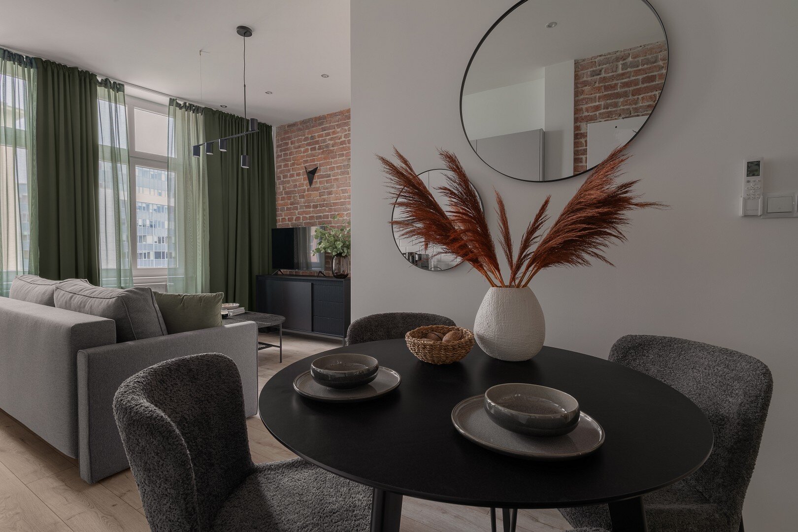Jasne wnętrze z akcentami w odcieniach beżu i zieleni wprowadza spokój i harmonię, a ściana z naturalnej cegły dodaje mu charakteru i niepowtarzalnego klimatu W przestronnej części dziennej znajdziesz rozkładaną kanapę  oraz jadalnię z okrągłym stołem – idealna na poranną kawę lub romantyczną kolację we dwoje. Nowoczesny aneks kuchenny został w pełni wyposażony, aby można było poczuć się tutaj jak w domu – jest tu ekspres do kawy Nespresso, czajnik, płyta grzewcza i niezbędne naczynia. W osobnej sypialni czeka na Ciebie wygodne łóżko z miękkim zagłówkiem, idealne na relaks po dniu pełnym wrażeń.