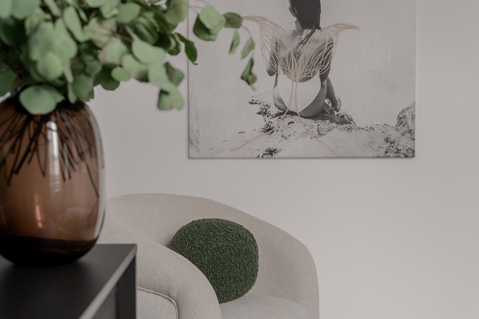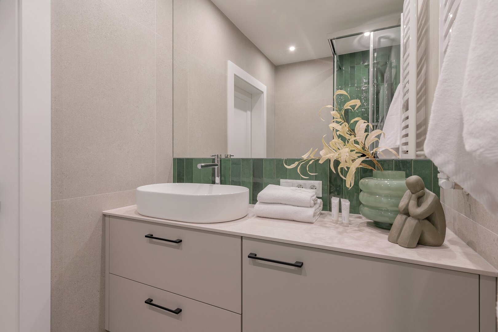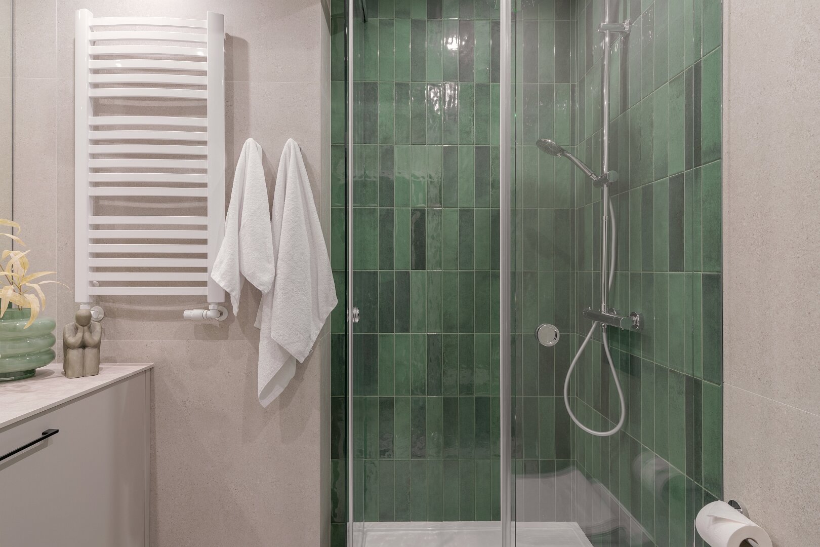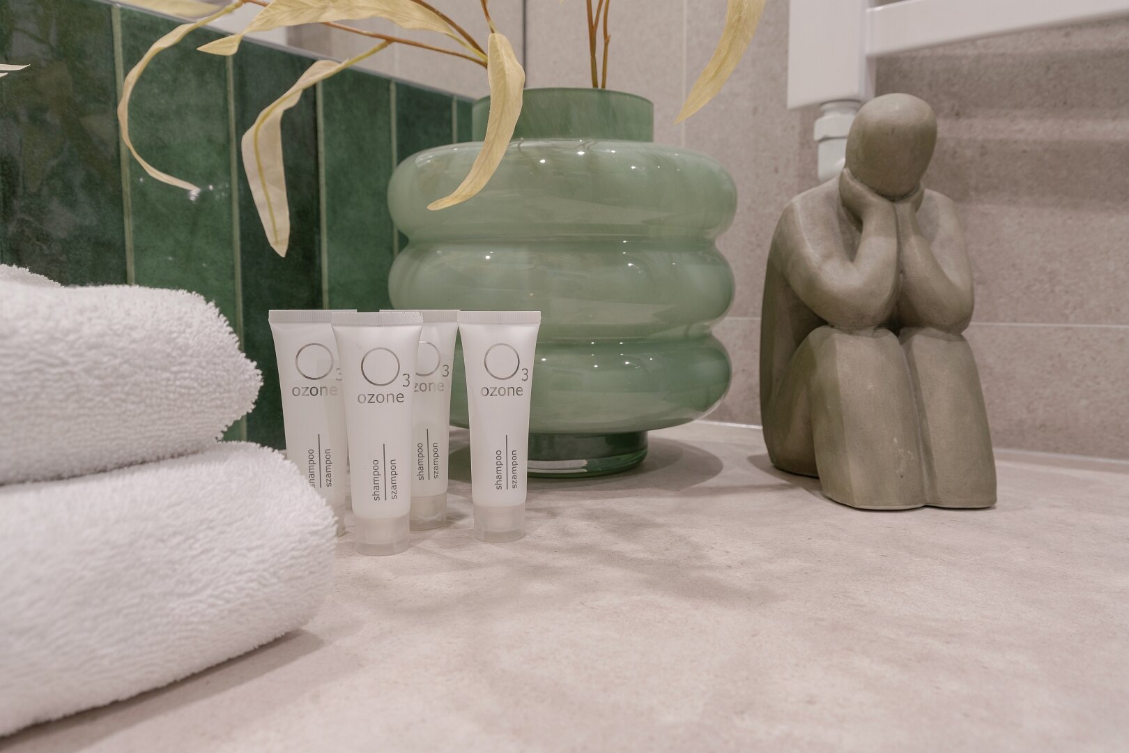 Jasne wnętrze z akcentami w odcieniach beżu i zieleni wprowadza spokój i harmonię, a ściana z naturalnej cegły dodaje mu charakteru i niepowtarzalnego klimatu W przestronnej części dziennej znajdziesz rozkładaną kanapę  oraz jadalnię z okrągłym stołem – idealna na poranną kawę lub romantyczną kolację we dwoje. Nowoczesny aneks kuchenny został w pełni wyposażony, aby można było poczuć się tutaj jak w domu – jest tu ekspres do kawy Nespresso, czajnik, płyta grzewcza i niezbędne naczynia. W osobnej sypialni czeka na Ciebie wygodne łóżko z miękkim zagłówkiem, idealne na relaks po dniu pełnym wrażeń.